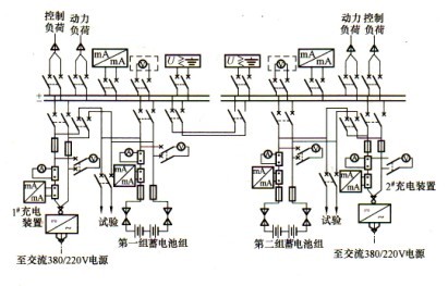 (3)方案三:?jiǎn)文妇€分段(一組蓄電池,兩套充電裝置)接線,見圖2-3。特點(diǎn):接線可靠、靈活,一組蓄電池經(jīng)兩個(gè)空氣斷路器分別接到兩段母線上。兩套相同容量的充電裝置接在不同
