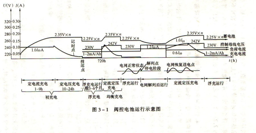 閥控電池組完成初充電后,即可轉(zhuǎn)為浮充電方式運(yùn)行。對于變(配)電所只有一組蓄電池時,浮充電就是充電裝置首先應(yīng)滿足直流負(fù)荷的要求,另外還要以小電流滿足電內(nèi)部的自放電要求。所以浮充電電流值等于直流負(fù)荷電流+浮充電流。浮充電補(bǔ)償電池內(nèi)部的自放電和外殼表面臟污后所產(chǎn)生的爬電損失。除直流負(fù)荷電流外,真正充進(jìn)電池內(nèi)