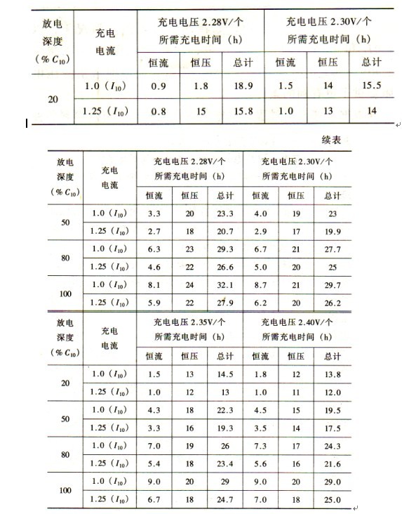 初充電一浮充電一均衡充電是按下列程序循環(huán)進(jìn)行的。在投運(yùn)前,對(duì)電池進(jìn)行初充電,此時(shí)用恒流為l.Oll0進(jìn)行充電。當(dāng)單體電池電壓上升到2.35V轉(zhuǎn)為恒壓充電,此時(shí)充電流逐漸減少,然后轉(zhuǎn)為正常運(yùn)行狀態(tài)即浮充電壓為2.25V。當(dāng)運(yùn)行720h后,進(jìn)行均衡充電,即先以恒流l.Ollo電池充電,至電池電壓為2.35V轉(zhuǎn)為恒壓充電,電壓恒定一段時(shí)間又轉(zhuǎn)為正常浮充狀態(tài)。當(dāng)交流電源中斷后,此時(shí)自動(dòng) 進(jìn)行均衡充電,以恒流l.Ol】o充電。電池電壓上升至2.35V后和上述運(yùn)行初充后均衡充電的過(guò)程相同。上述兩階段充電,其浮充轉(zhuǎn)均充的判斷大多采用時(shí)間來(lái)整定,即不論放電幅度如何,一日由恒流階段轉(zhuǎn)入恒壓階段后,延時(shí)若干個(gè)小時(shí),則自動(dòng)轉(zhuǎn)為浮充。實(shí)際情況是充電所需時(shí)間與放電幅度有關(guān),如圖3-1所示。因此事故放電的深度是隨機(jī)的,若用一個(gè)固定的時(shí)間來(lái)操作,則有可能造成電池的過(guò)充或欠充,所以采用蓄電池回路的充電電流作為均充終期的判據(jù)是較合理的。不同放電深度后充電的所需時(shí)間見(jiàn)表3-1。表3-1    不同放電深度后充電所需時(shí)間