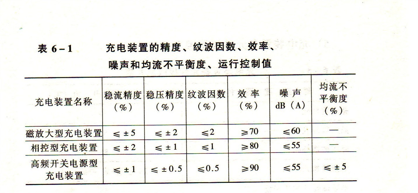 4)充電裝置的精度、紋波因數(shù)、效率、噪聲和均流不平衡度、運行控制值,見表6-1.
